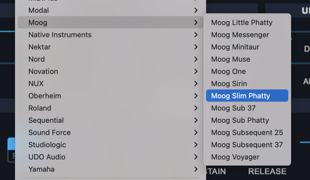 From the drop-down menu, select “Moog>Moog Slim Phatty” to activate that hardware profile.