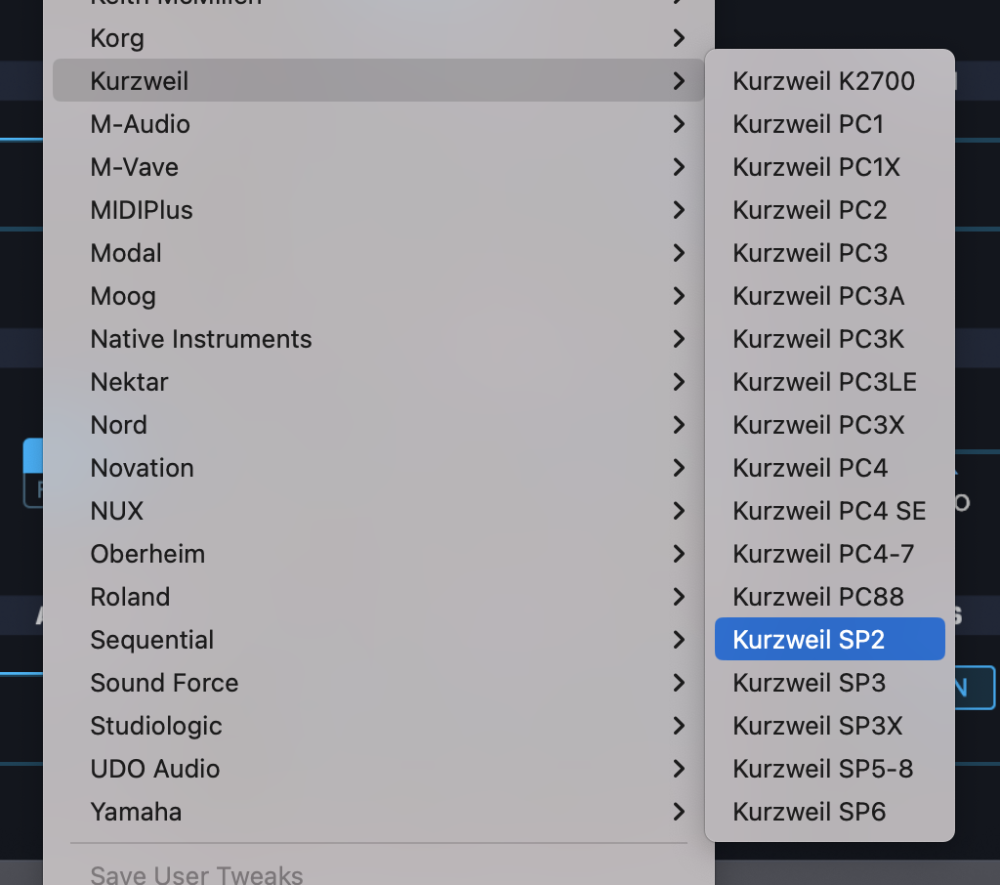 - From the drop-down menu, select “Kurzweil > Kurzweil SP2” to activate the SP2 hardware profile.