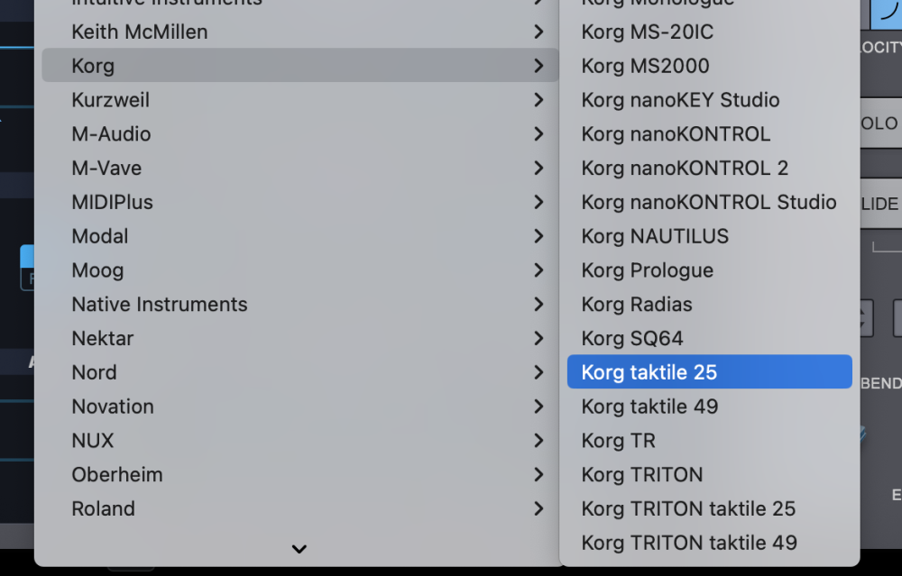 - From the drop-down menu, select “Korg > Korg taktile 25” to activate the taktile 25 hardware profile.