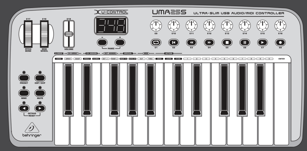 - If needed, you can quickly activate Preset 1 by pressing and holding the [PRESET] button then press button [E1] which located below the first knob. After doing so, you should see ‘P1” displayed on the UMA25S.