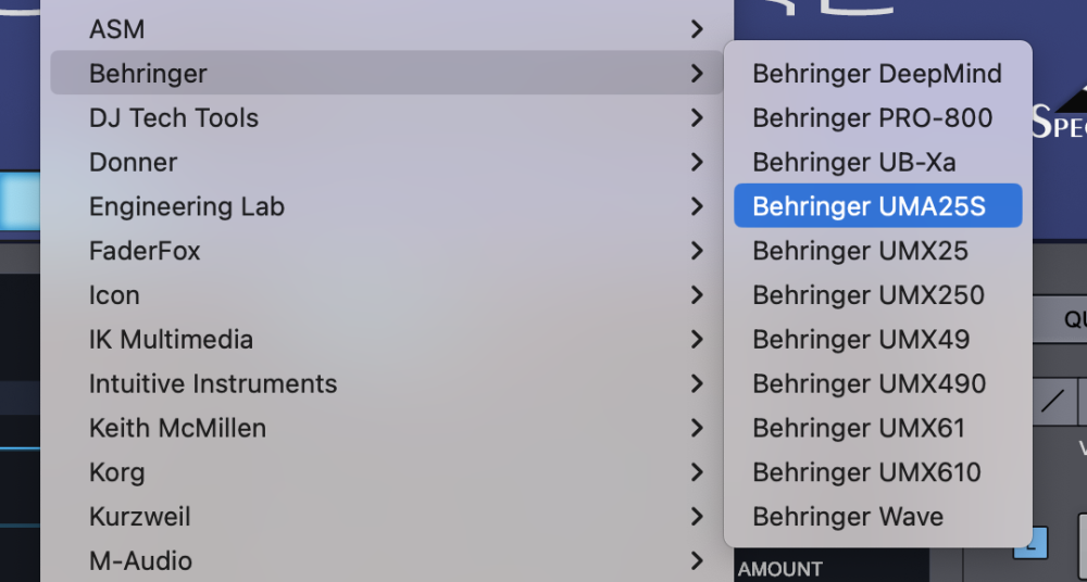 - - From the drop-down menu, select “Behringer > Behringer UMA25S” to activate the UMA25S Hardware Profile.