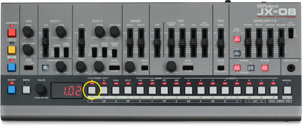- Check the firmware (system program version) of your JX-08 by holding down [PART A(1)] button switch on the power to the unit.