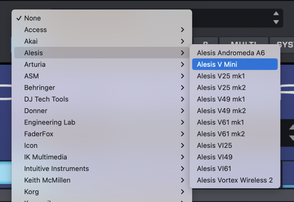 - From the drop-down menu, select “Alesis > Alesis V Mini” to activate the V Mini Hardware Profile.