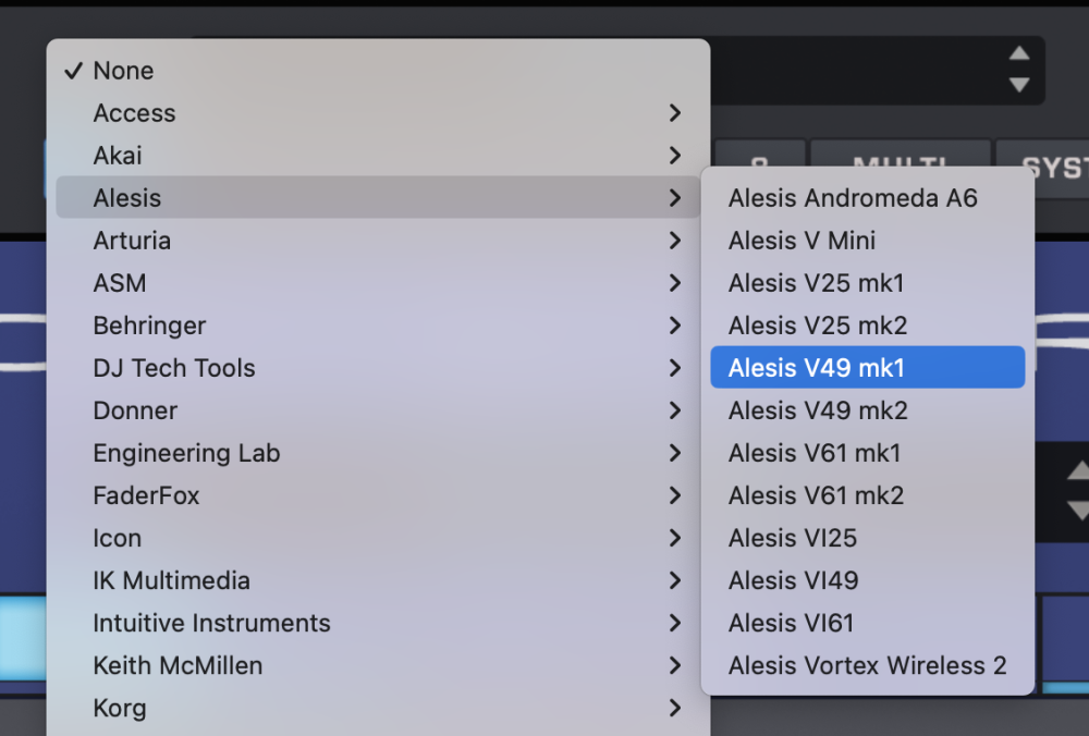 - From the drop-down menu, select “Alesis > Alesis V49 mk1” to activate the V49 mk1 Hardware Profile.