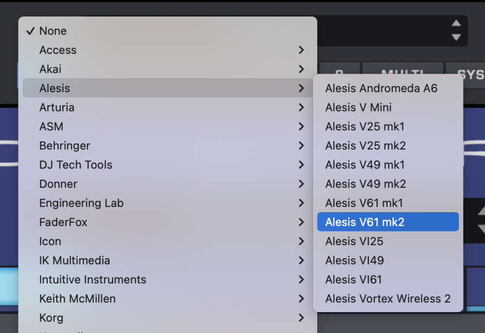 - From the drop-down menu, select “Alesis > Alesis V61 mk2” to activate the V61 mk2 Hardware Profile.