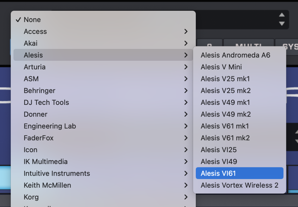 - From the drop-down menu, select “Alesis > Alesis VI61” to activate the VI61 Hardware Profile.