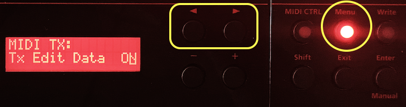 - Using the < > buttons select the page “MIDI TX – Tx Edit Data.”