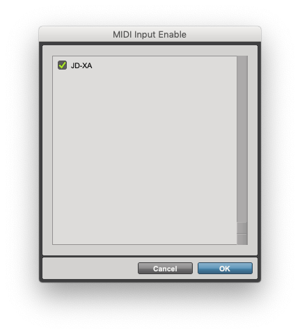 - Enable “JD-XA” as a MIDI input device in the host software (DAW, Standalone, etc.).