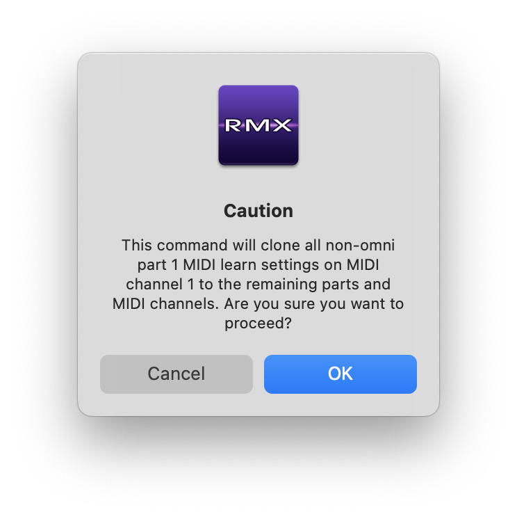 This menu item copies all the non-omni mode MIDI Learn assignments from Part 1 and applies them to Parts 2-8. This is a huge time saver as it saves having to manually assign 7 more identical Parts if you want the same assignments for every Part. A warning dialog box appears to confirm that you wish to do this.