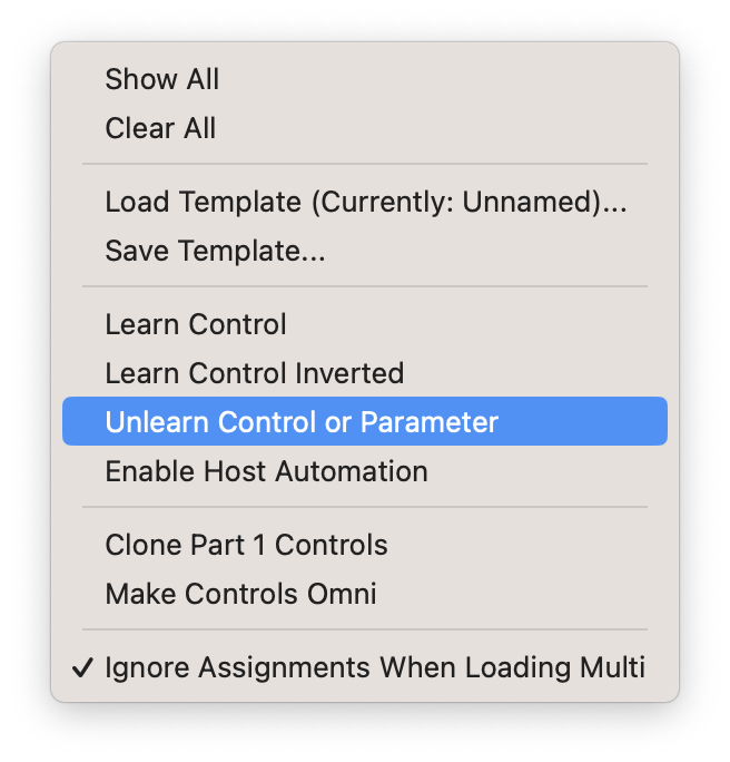 This menu item deletes the MIDI Learn assignments for a MIDI control or RMX parameter—whichever is moved after selecting this item. For example, if you choose this item, then move an RMX slider, any MIDI learn assignments for the parameter controlled by that slider will be deleted. If you move a MIDI controller after selecting this item, any MIDI learn assignments for that controller will be deleted.