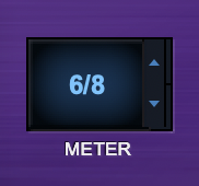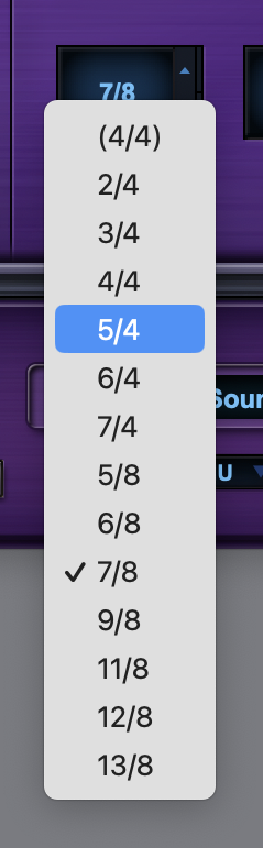 Clicking on the Meter Display opens the Meter Menu and displays a selection of time signatures. The first time signature (shown in parenthesis) is the original time signature of the currently loaded Groove Element.