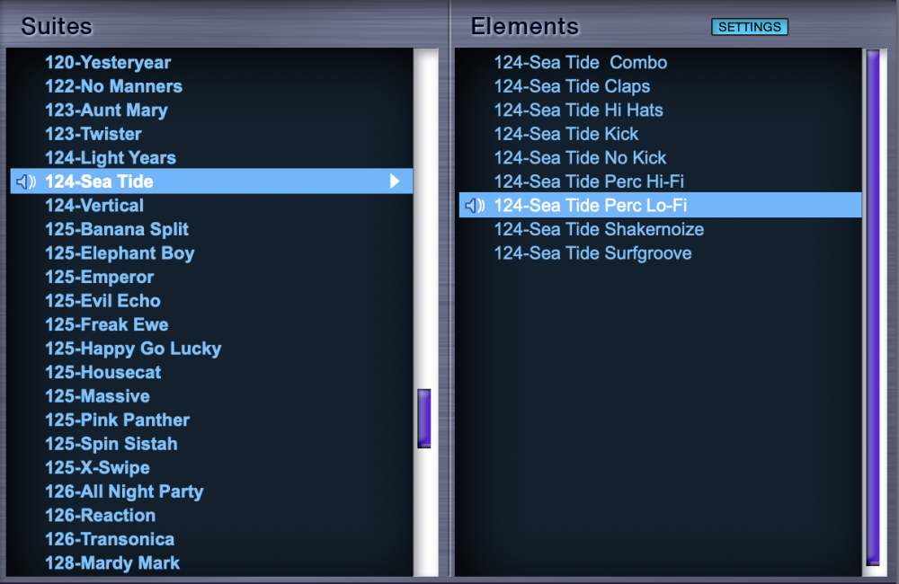 A Suite is essentially a folder/sub-directory that contains one or more Elements. Once a Directory has been selected, the left Suites column will display all the Suites available in that directory. Clicking a Suite name reveals it’s contents in the Elements column on the right. In the picture above, RMX Grooves is selected as the Sound Directory. As a result, the Suites column displays a long list of all the available Suites in this Sound Directory, organized alphabetically by tempo from slowest to fastest original tempo. No sound can be played directly in the Suites column.