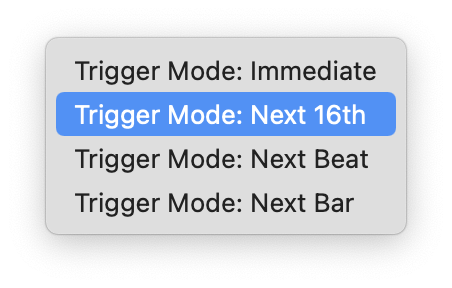 This Trigger Mode waits until the next beat to play whatever note/play command was sent. The delay is a maximum of one beat. Next Beat mode also makes it simple to synchronize multiple grooves by playing a note or pressing Play before the next beat.