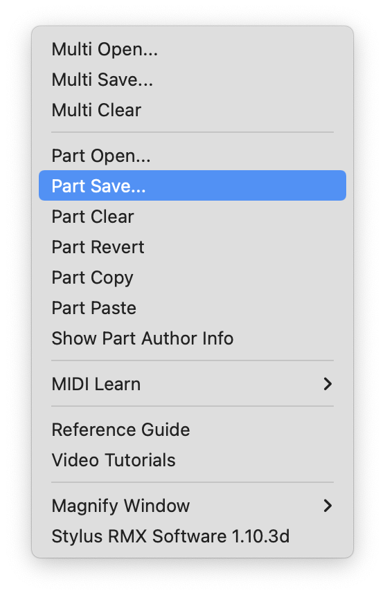 The Utility Menu contains several options that allow you to manage Parts. You can Open, Save, Clear, Revert, Copy, and Paste Parts. You can also find out who created a Groove Element with the “Show Part Author Info” feature.