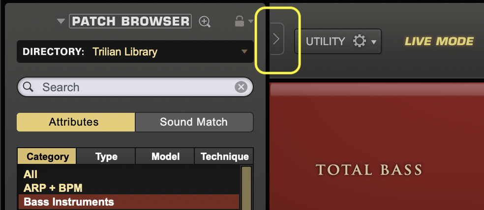 The Mini-Browser lets you browse and edit sounds without switching pages. It is displayed in the left-most area of the Trilian interface and provides convenient Patch and Multi browsing with the Trilian controls still easily accessible.