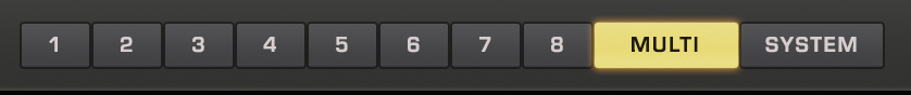 Selecting the MULTI button gives you access to any of the pages in the Multi Section, including the MIXER, Aux/Master FX, and the LIVE MODE and STACK MODE pages.