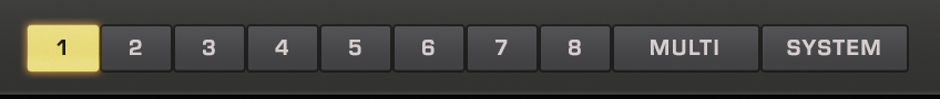 The Navigation Buttons in the header are used to select and view any of the eight Parts, the Multi Section, or the System Page. Only one button can be selected at a time.