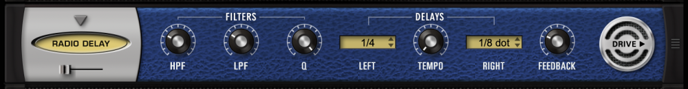 Radio Delay is essentially a hybrid of a dual-mono BPM-style delay, but with the delayed signals running through the Valve Radio distortion filter. This produces cool, dual-filtered echo effects that sound like they are coming from distorted old speakers or radios. Another cool trick with this delay is that it can be “de-synced” from the host’s tempo and set to a completely different tempo, so that the delays don’t always have that “perfect” sound to them. A useful and interesting effect!