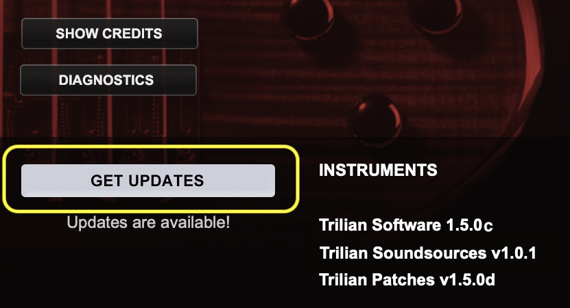 With an active Internet connection, when you first open Trilian it will automatically check for any available updates for all the Spectrasonics instruments and libraries installed in your computer. If everything is up-to-date, Trilian’s splash screen will display “You are up to date” in green text below the DIAGNOSTICS button: