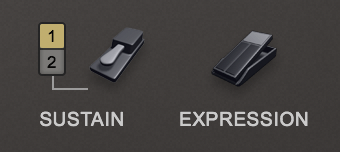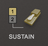There are two Sustain Modes available in the Footer—Standard Sustain (Mode 1) and Alternate Sustain (Mode 2). The Sustain Mode selection switches (numbered 1 and 2) allow you to switch between modes, and are MIDI-Learnable switches.